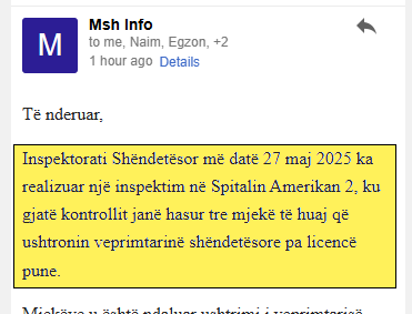 “Inspektorati Shëndetësor, më datë 27 maj 2025, ka realizuar një inspektim në Spitalin Amerikan 2, ku gjatë kontrollit janë hasur tre mjekë të huaj që ushtronin veprimtarinë shëndetësore pa licencë pune”, thuhet në përgjigjen e Ministrisë.