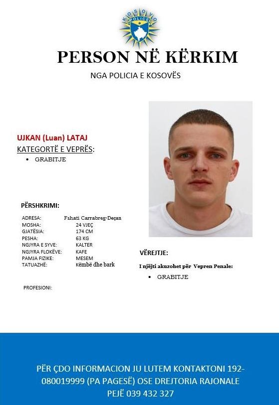 I kërkuari është Luan Ujkan Lataj, i lindur më 2 gusht 2001, nga fshati Carrabreg i Deçanit. Policia apelon te qytetarët që të japin çdo informacion për vendndodhjen e tij duke kontaktuar Policinë e Kosovës ose stacionin më të afërt policor.